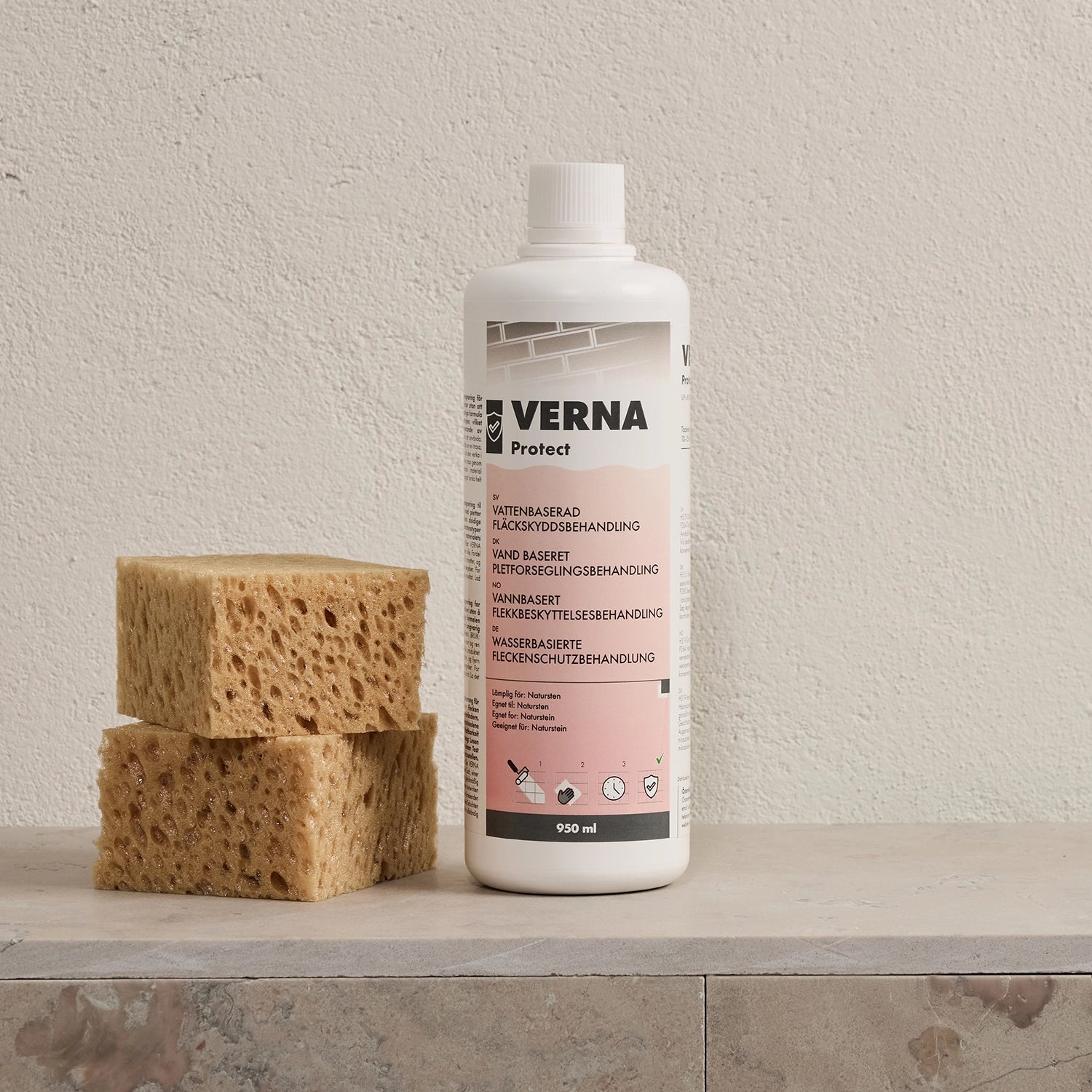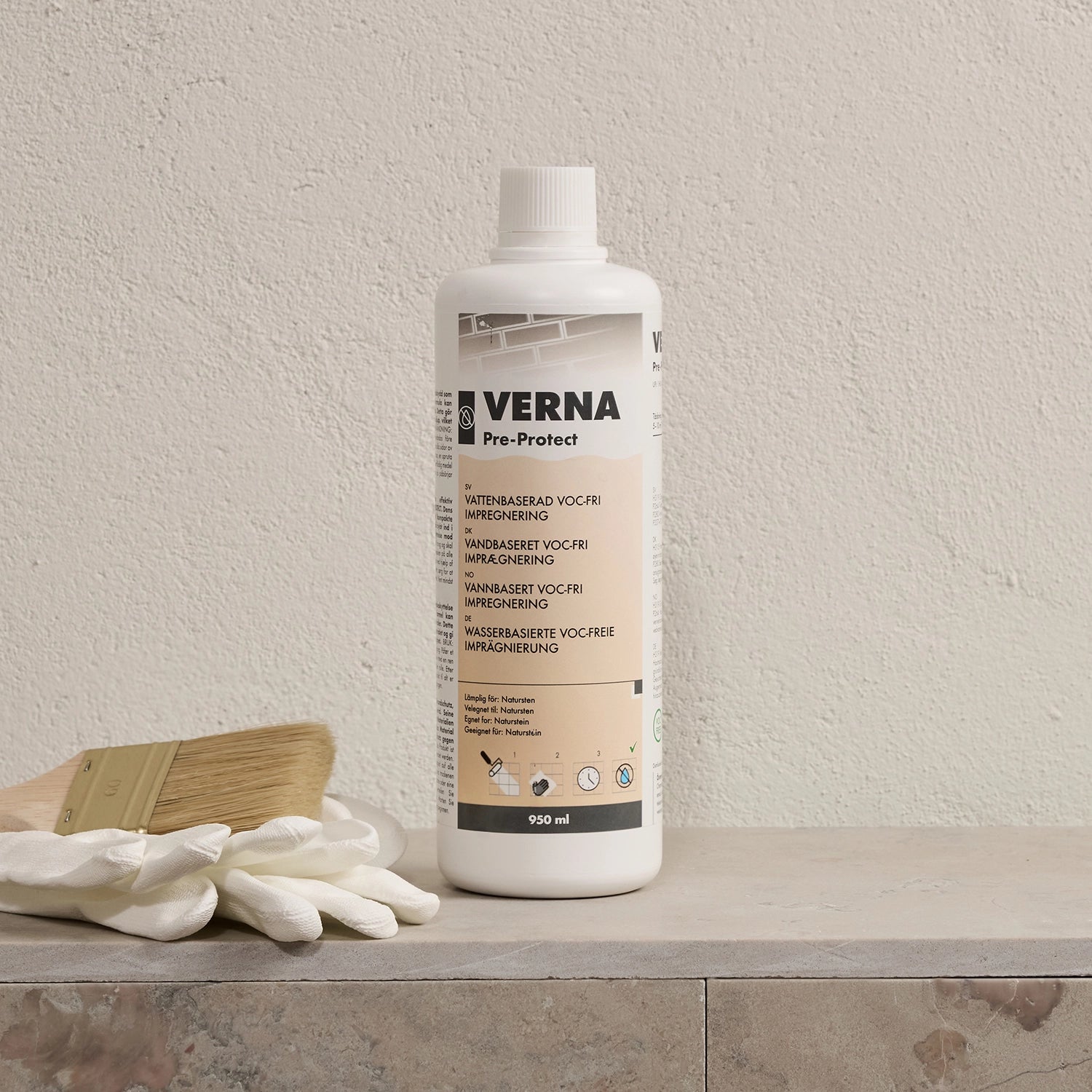 Impregner etter fuging. Når gulvet er fuget, rengjør overflaten med VERNA DEEP CLEAN, la steinen tørke og impregner deretter med VERNA PROTECT. Følg anvisningene på emballasjen nøye. I spesielt utsatte områder, for eksempel i dusjsonen, anbefaler vi å impregnere våre natursteiner én gang per år.